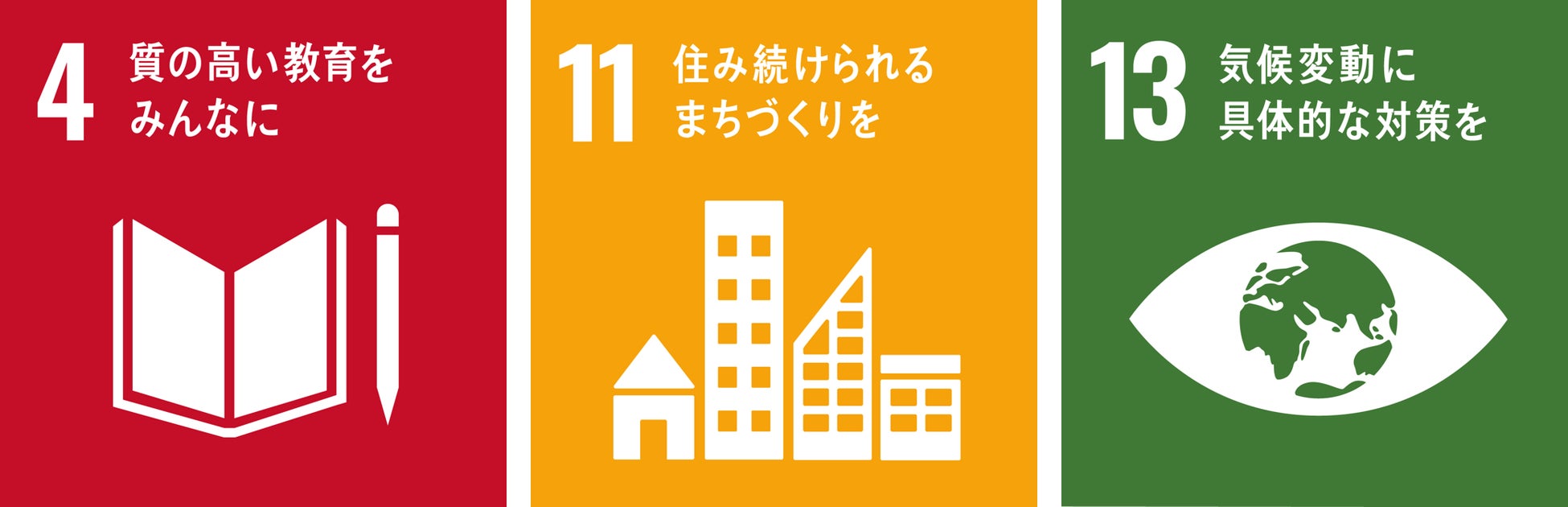 SDGsの取り組みとして「目標4、質の高い教育をみんなに」、「目標11、住み続けられるまちづくりを」「目標13、気候変動に具体的な対策を」のゴール達成のために貢献いたします。