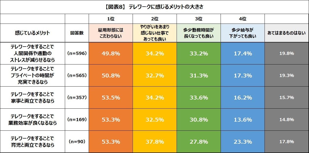 また、このメリットがどれくらいのものか、他のものと比べてもらうと、テレワークで人間関係や通勤のストレスが減らせるなら、「雇用形態にはこだわらない」と回答した人が49.8%などと、何かしらと引き換えにしても良いと感じる人が8割以上いることがわかりました。とくに雇用形態に関しては、どの項目でも最も高い数値となっており、テレワークができるなら、雇用形態にはこだわらないという人が多い結果となりました。(図表8)。
