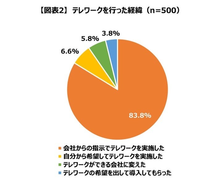 - テレワークを行った経緯は会社からの指示が83.8%、コロナ禍での実施が多い