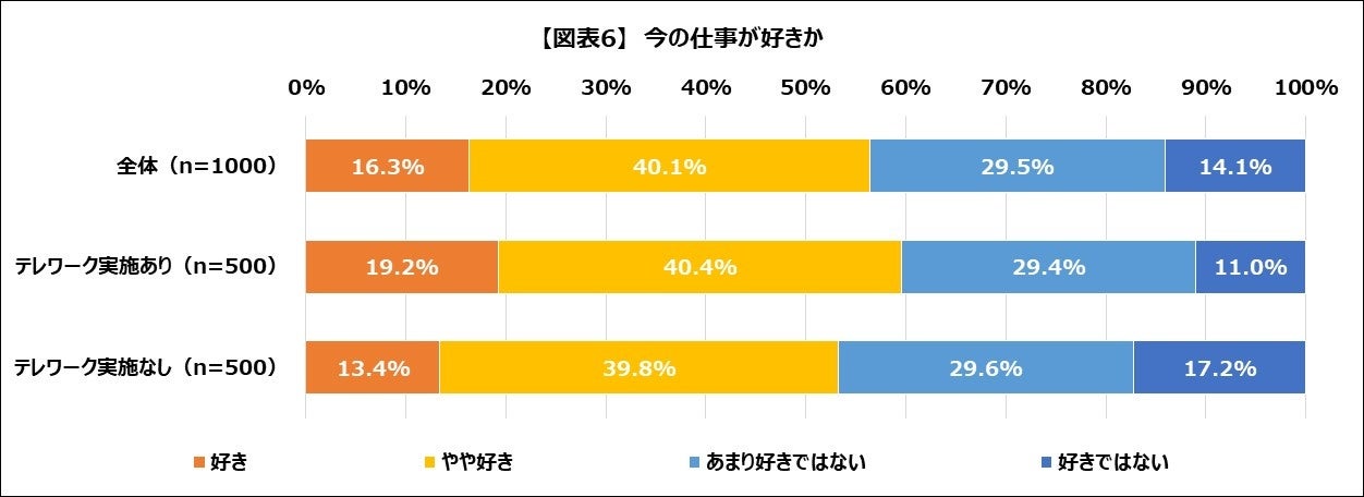 続いて、今の仕事についてお聞きしました。その結果、テレワーク実施者は計59.6%が今の仕事が「好き」と回答し、未実施者は53.2%が回答する結果となりました。その差は6.4ポイントとなり、テレワークは従業員のエンゲージメントを高めていると推測できます(図表6)。