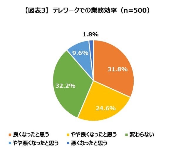 - テレワークでの業務効率は計56.4%が「向上」、仕事のモチベーションも計63.0%が「上がった」と回答