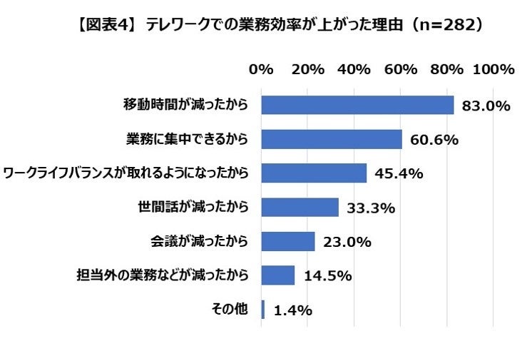 テレワークでの業務効率について聞くと、「良くなったと思う」31.8%、「やや良くなったと思う」24.6%と計56.4%が業務効率の向上を感じているようです。「変わらない」32.2%を含めると計88.6%が業務の効率を維持できていることがわかりました(図表3)。業務効率が上がった理由は「移動時間が減ったから」が83.0%で最も多く、「業務に集中できるから」60.6%、「ワークライフバランスが取れるようになったから」45.4%と続く結果となっています(図表4)。