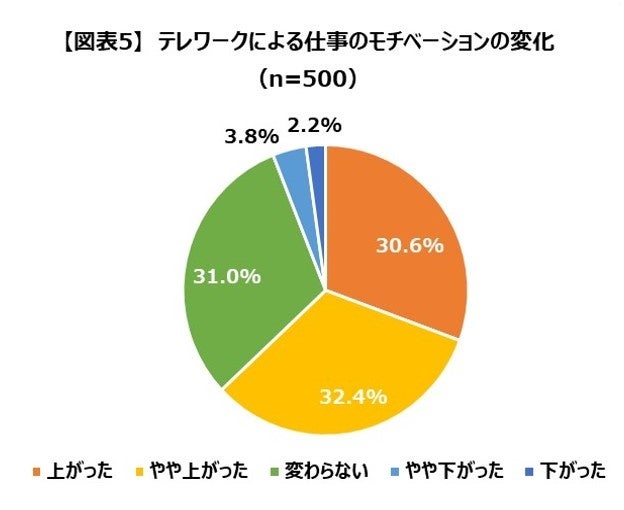 テレワークにより、仕事のモチベーションは計63.0%が「上がった」と回答し、テレワークが業務に与えるポジティブな影響が改めてわかる結果となりました(図表5)。