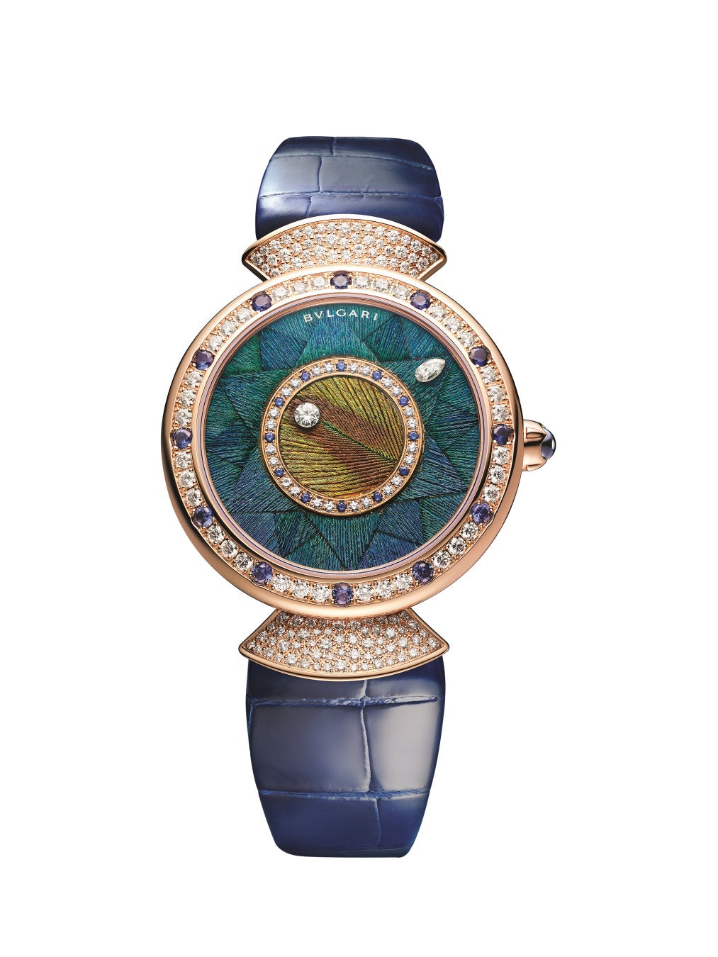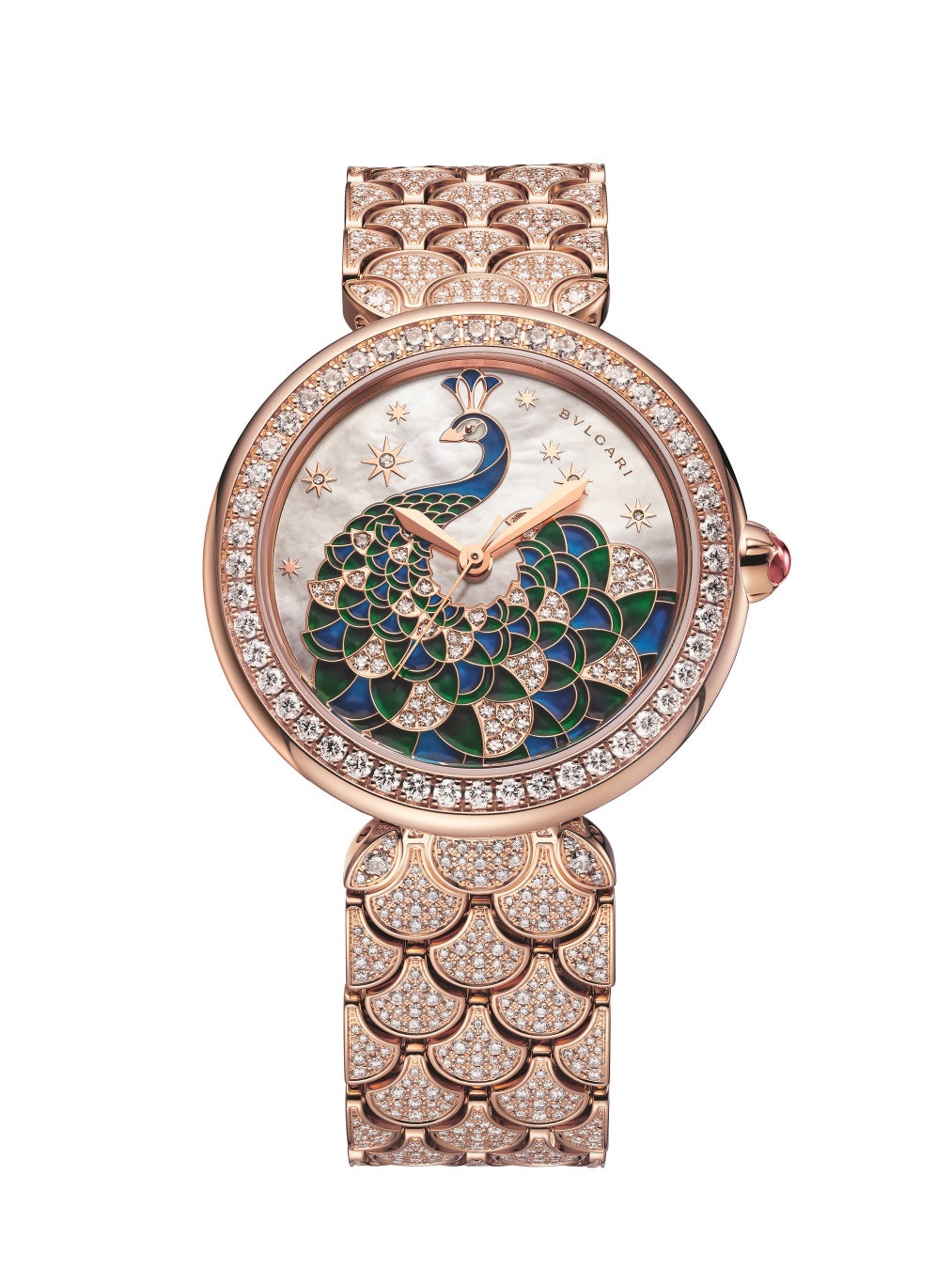 「ディーヴァ ドリーム」は、動物をモチーフとするブルガリの神話的なストーリー、「アニマリ ファンタスティ」の中で気高く美しいクジャクへの賛美を具現化したタイムピースであり、ブルガリの起源であるジュエリーをタイムピースの形で昇華したものです。