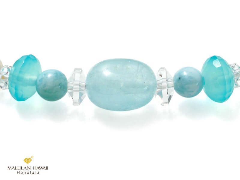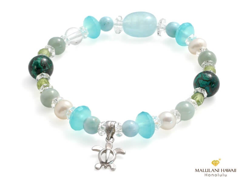 空や海の象徴アクアマリンを冠に、母なる地球の象徴クリソコラ、太陽神の象徴ペリドットなど、ハワイの大自然に包まれる癒しの石をセレクトしたブレスレットは、健康と幸福をもたらす海の守り神として愛されているホヌ(ウミガメ)のハワイアンジュエリーを装着した、明るく健やかなブレスレット。