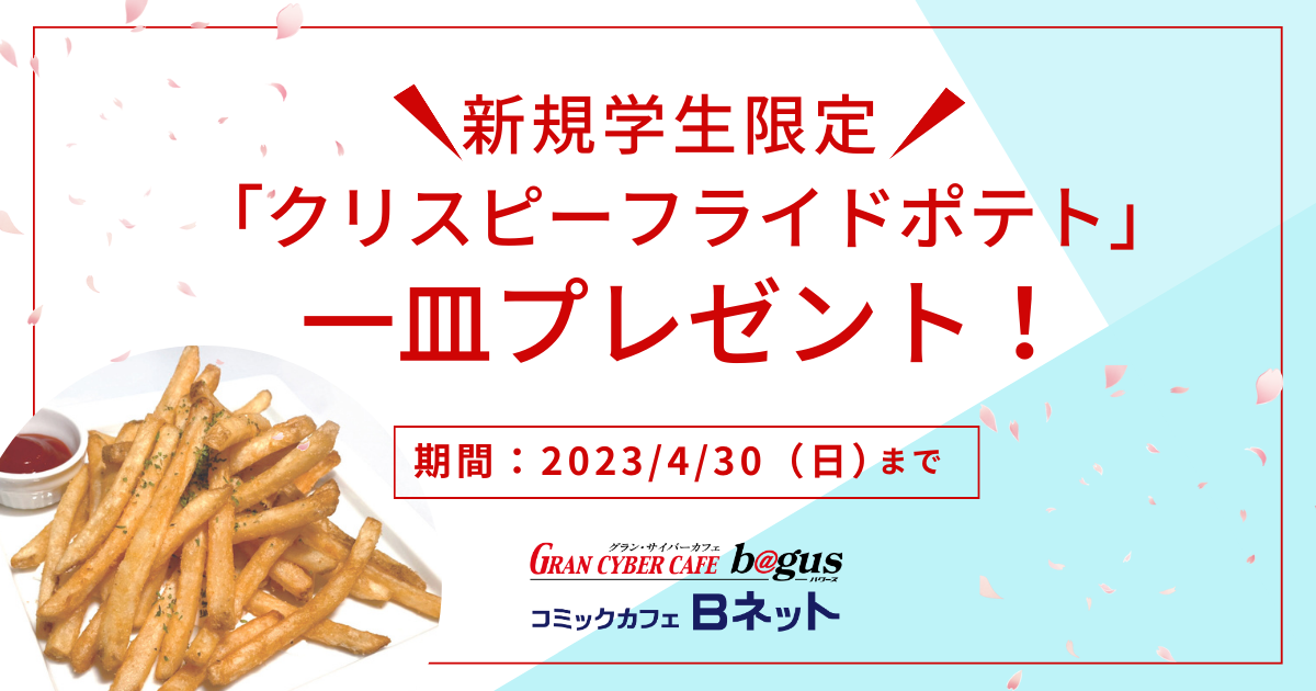 新天地の癒しスポットに!新社会人・学生に向けて「フライドポテト一皿サービス」や「フード10%OFF」など『新生活応援キャンペーン』実施 ~ BAGUSインターネットカフェ ~