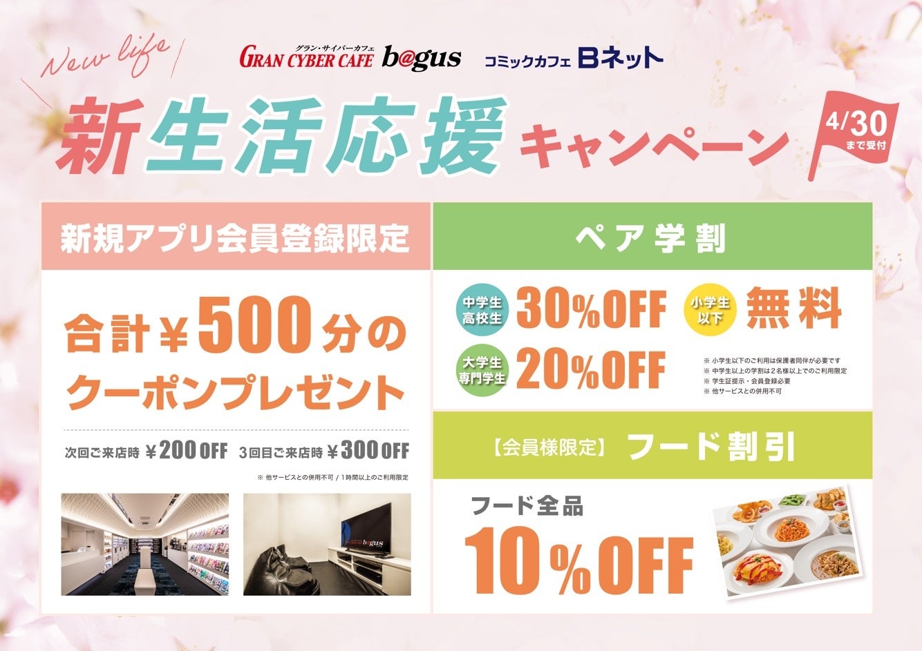 インターネットカフェ「グランサイバーカフェ バグース」「コミックカフェBネット」では、新生活を迎える社会人、学生の方に向けて3月13日(月)から『春の新生活応援キャンペーン』を実施します。