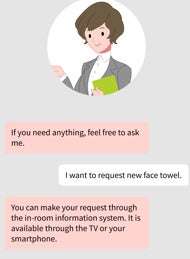 本サービスは、シンプルで分かりやすいユーザーインターフェースの管理画面から、施設のウェブサイトのURLやPDF、Microsoft(R) Excelを登録するだけで、客室の設備や季節のイベント情報、周辺の観光スポットなどをコンシェルジュに学習させることができます。コンシェルジュの話し方やビジュアルも簡単にカスタマイズが可能です。レストランや大浴場の営業時間、チェックアウトの方法など、ゲストの問い合わせに24時間いつでも応対が可能になり、満足度の向上に貢献します。日本語のほか、英語にも対応。訪日観光客とのスムーズなコミュニケーションが可能です。また、ゲストのスマートフォンを利用するため、新たな機器の導入が不要です。