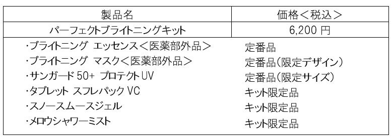 春から夏にかけては、紫外線量の増加や気温の上昇に伴い、1年の中でも肌にとって過酷な環境であり、シミやくすみ以外にも、乾燥やほてりなどの肌悩みが増えてくる季節です。本キットは、そのような夏のあらゆる肌悩みにさまざまなアプローチで応える6アイテムをセットしたスペシャルキットです。