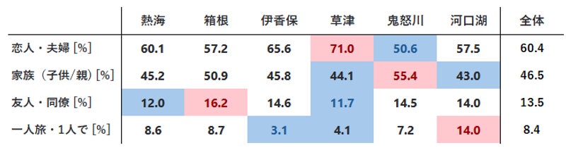 訪問者の構成では、草津が恋人・夫婦層に人気で71%を占め、静かに過ごせる温泉地としての魅力が支持されたと見られます。一方で、鬼怒川は家族連れが55%と最多となりました。