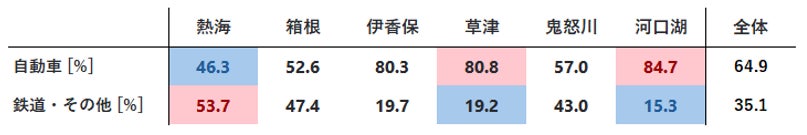 また、各観光地への移動手段をジオテクノロジーズの人流データから推定したところ、全体では「自動車」が65%、「鉄道・その他」が35%という結果となりました。なかでも熱海や箱根では鉄道利用が多く、これは若者の来訪が多く、公共交通の利便性が高いことが背景にあると推察されます。
