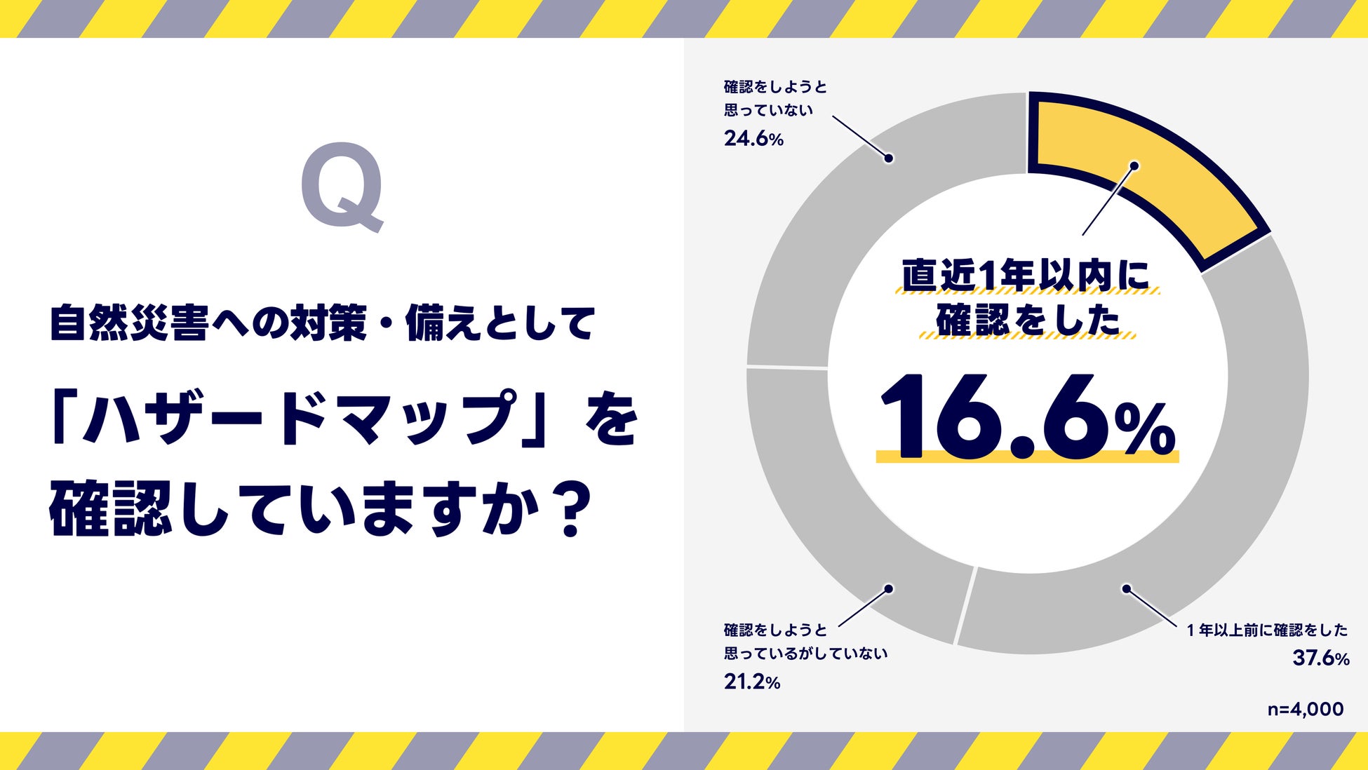 このような中、LINEヤフーが2025年8月に実施した防災意識調査※では、災害への備えとして重要な「ハザードマップの確認」について、直近1年以内に実施した人は「16.6%」にとどまり、認知はされているものの実際の行動に結びついていない実態が浮き彫りになりました。