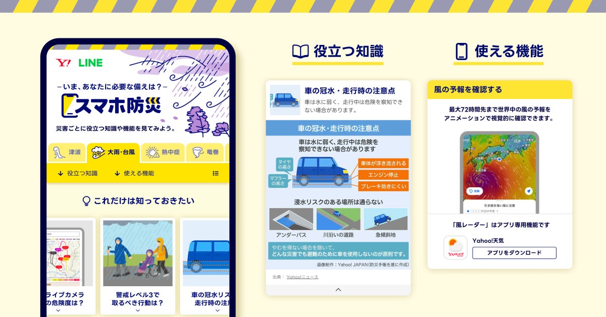 LINEヤフーは、災害が頻発する日本において、多くのユーザーに向けてメディアやコミュニケーションのプラットフォームを提供する企業として、「災害支援」「防災・減災」を最も重要なテーマのひとつと位置づけています。今後も、被災地の支援や防災・減災に向けた取り組み、サービスの開発や提供を通して「あらゆる災害の、あらゆるシーンでひとりでも多くの命が助かる未来」を目指していきます。