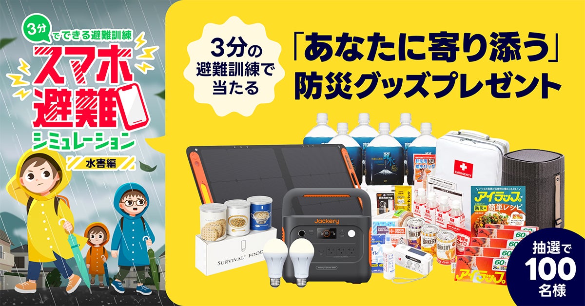 本キャンペーンでは、特設サイトにて実施している約3分の避難訓練「スマホ避難シミュレーション<水害編>」にご参加いただいた方の中から、抽選で合計100名様に防災グッズを進呈します。ポータブル電源や防災リュック、停電時にも点灯するLED電球、防災グッズを収納できるインテリアスツール、10年以上備蓄が可能な保存食や保存水など実用的な防災グッズです。