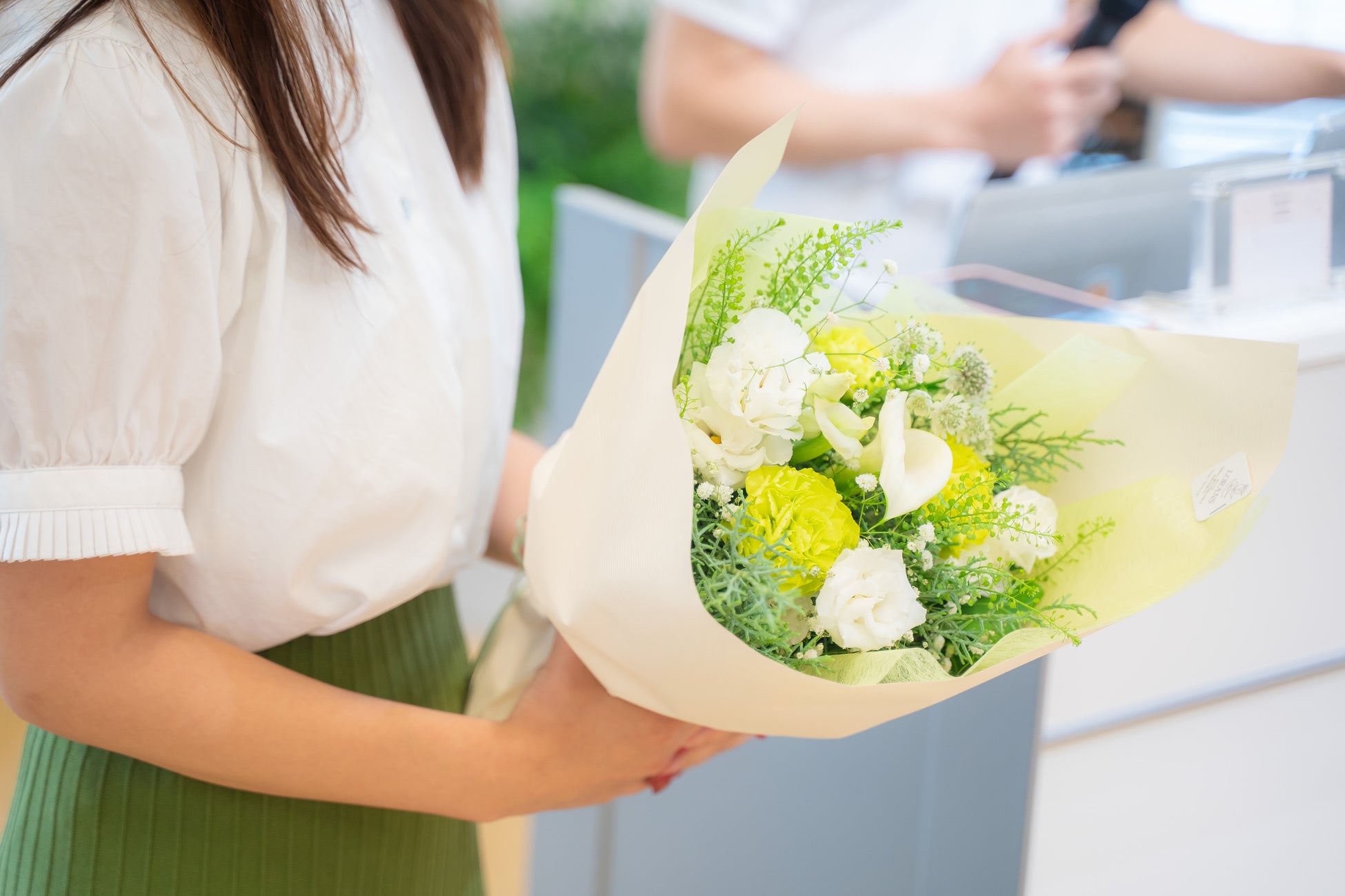 社内では、新卒入社式に桜など春の花の装飾と花束で迎え入れる他、中途入社や復職、雇用形態の変更を祝って月毎に開催する中途入社式や、退職や休職などの様々なシーンで、感謝や労いの気持ちを花言葉や色に込め、社員に花を贈っています。