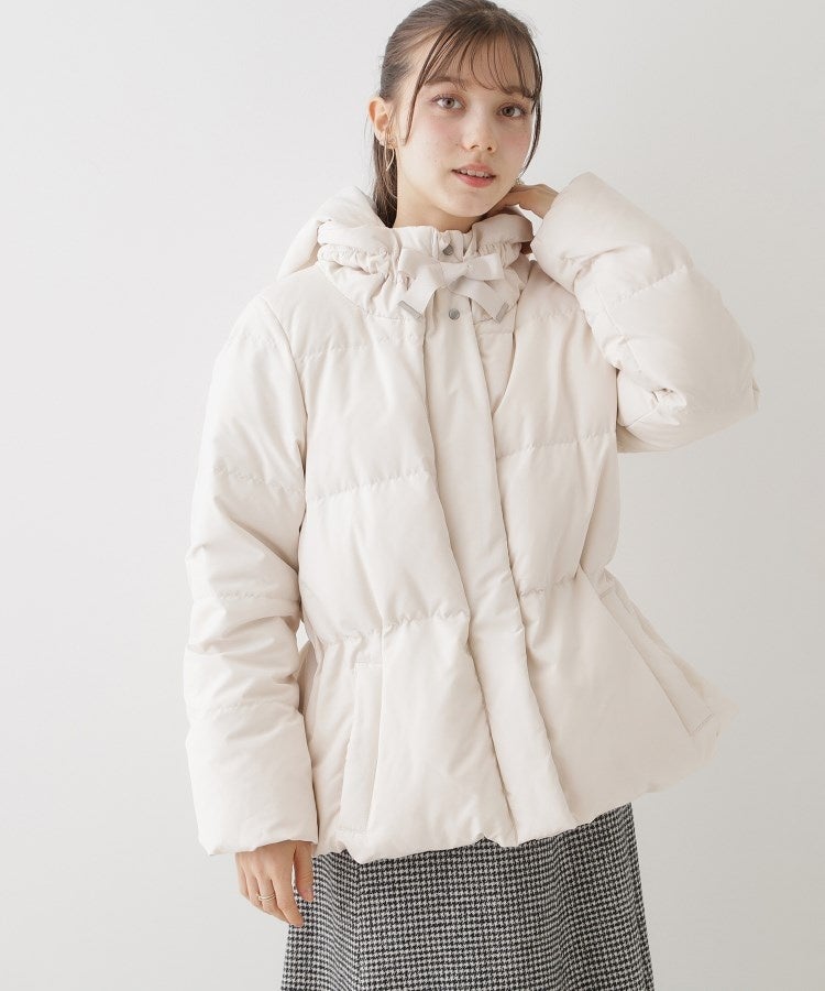 2022年秋冬にローンチした『愛されダウン』は、スタンドカラーのギャザーデザインと、首元についた太めのグログランリボンが魅力の大人フェミニンなアイテムです。パーツごとにダウンの分量を調整することで着膨れを防ぎ、すっきりとしたシルエットを実現してくれます。