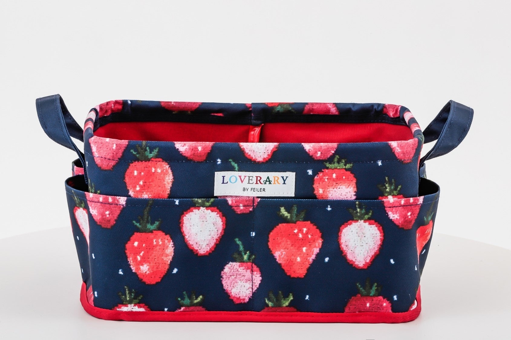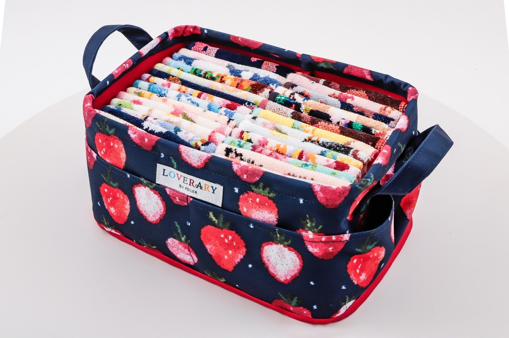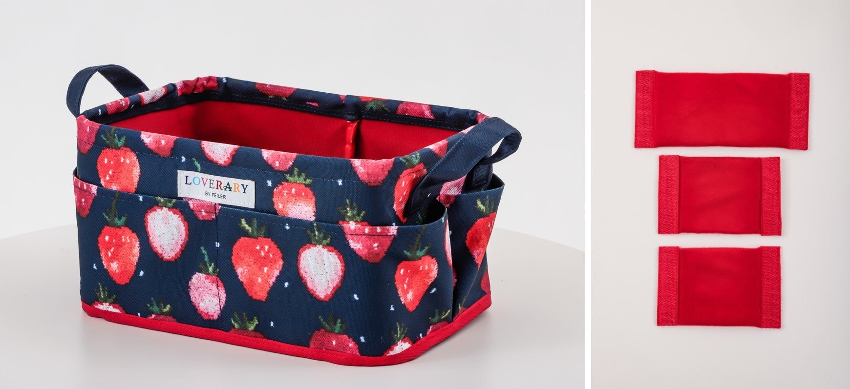 スペシャルアイテムはLOVERARY BY FEILERのなかでも特にファンの多い、甘酸っぱいストロベリーに、チャーミングなドットをトッピングしたデザイン「ストロベリードット」の新色、上品なネイビーベースの収納ボックス。4つの外ポケットと動かせる仕切りつきで収納力と整理力はバツグン。動かせる仕切りは面ファスナーで着脱できるので、中に入れるものに合わせてアレンジできるのも高ポイントです。