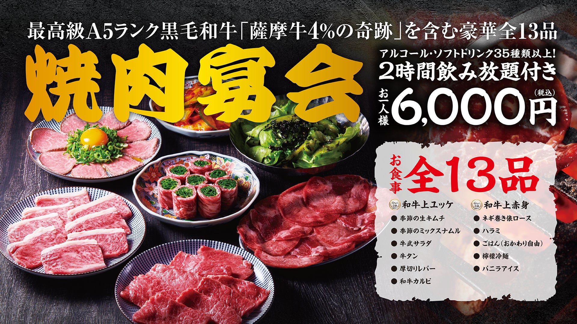 11月13日(水)より、最高級A5ランク和牛”薩摩牛4%の奇跡”を含む全13品、120分飲み放題付き(生ビール含むアルコール・ソフトドリンク約35種類以上)の「焼肉宴会コース」をお1人様6,000円(税込)で販売いたします。