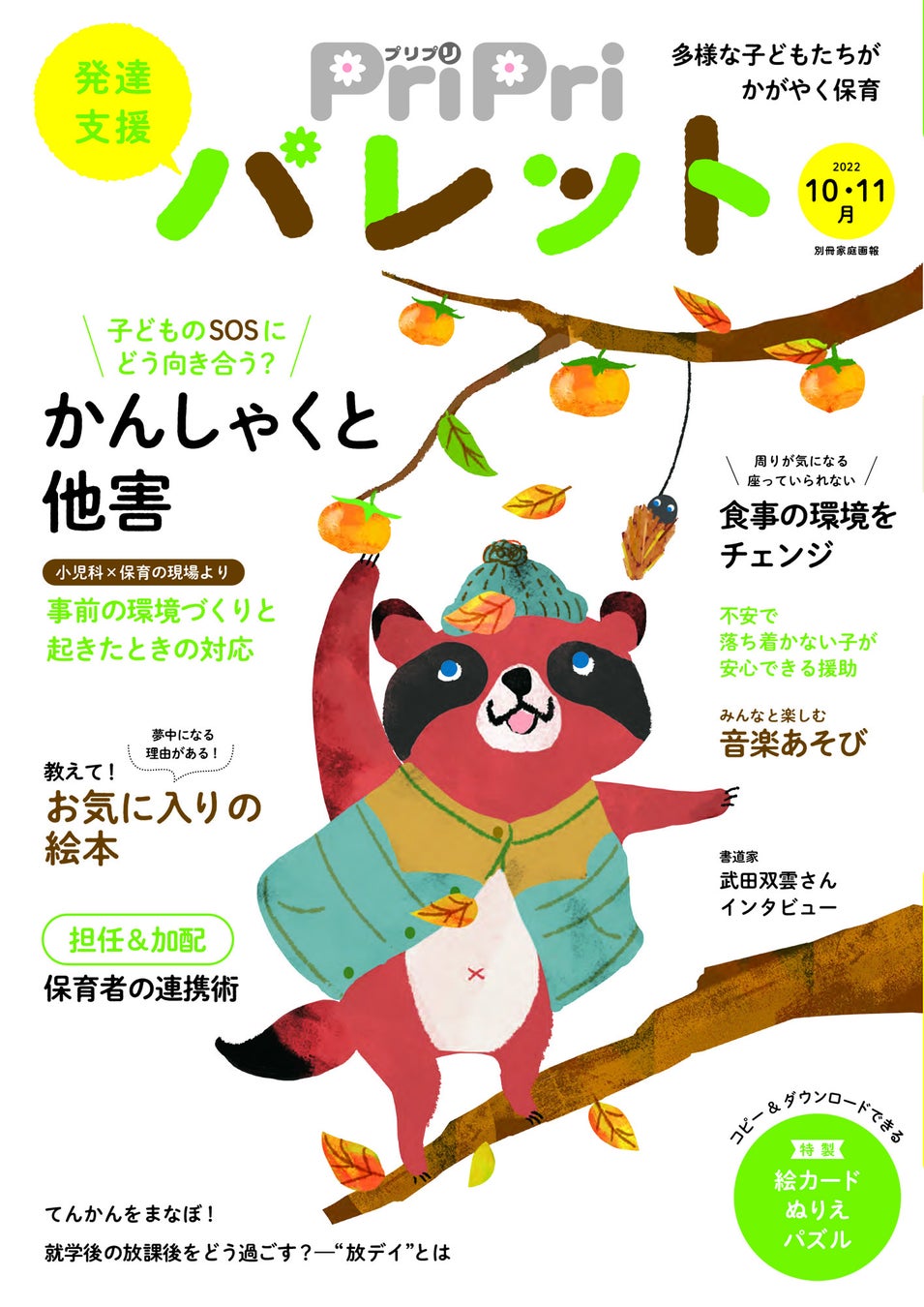 8月29日(月)発売の『PriPriパレット10・11月号』は、多くの保育者が対応に悩む「かんしゃくと他害」を大特集。事前の環境づくりとかんしゃくや他害が起きたときの対応を徹底解説。また、アンケートで教えてもらった「発達に課題のある子が夢中になる絵本」の紹介や、「担任&加配保育者の連携術」の特集にも注目です!
