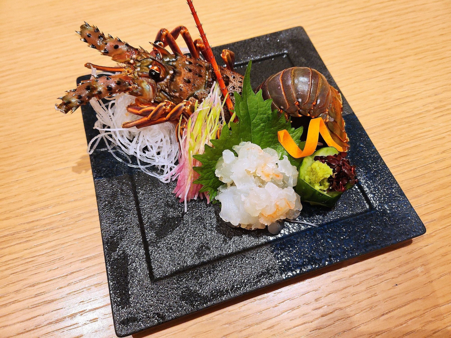 伊勢海老のお造りは、色鮮やかな赤い殻を持つ伊勢海老を、そのままお造りにしているため豪華で美しい見た目。