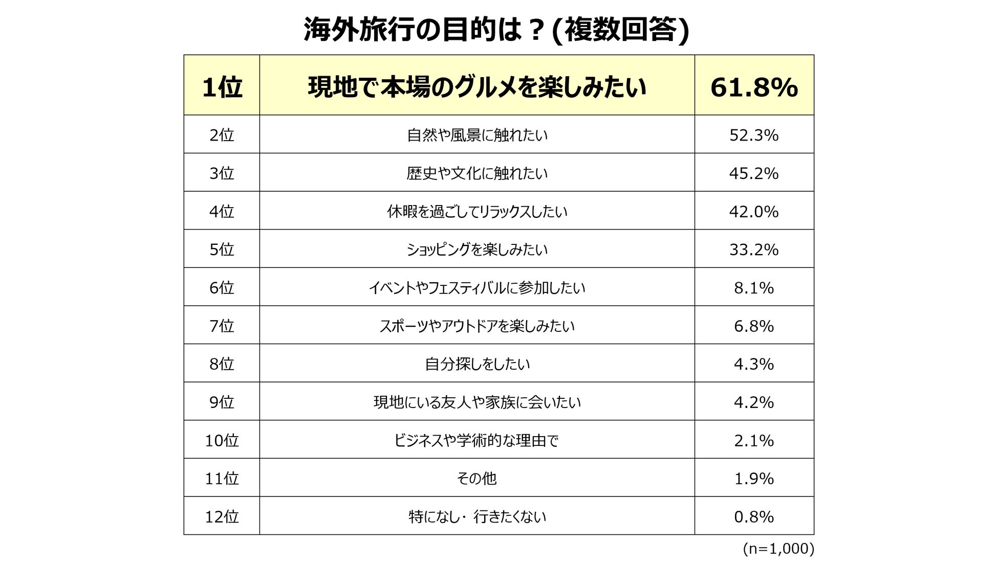 また、回答者全員に「海外旅行する場合の目的」を聞いた結果では、「現地で本場のグルメを楽しみたい」が最も高い回答割合で61.8%でした。