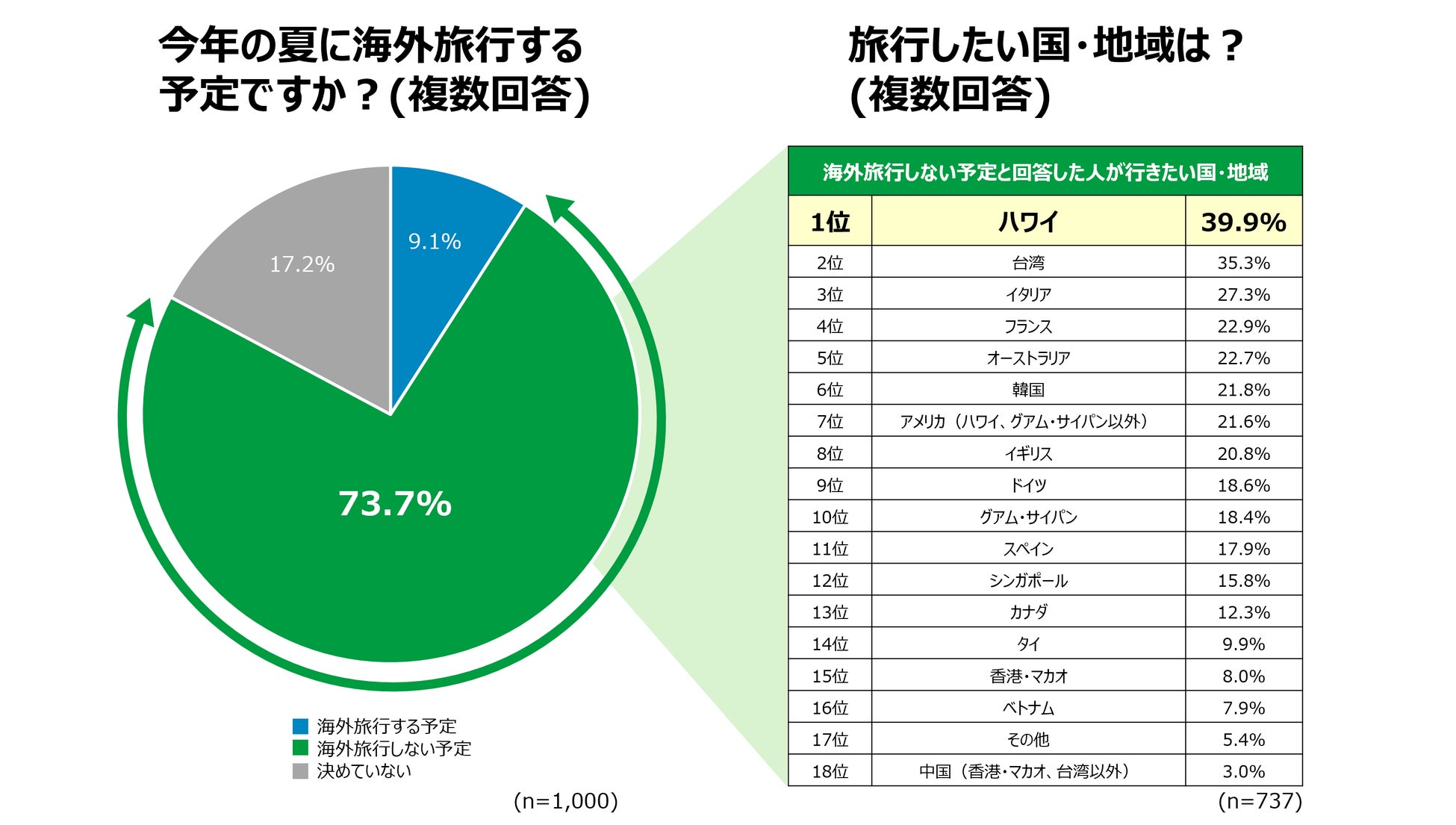 調査では今年の夏に「海外旅行する予定」と回答した人の割合は9.1%、「海外旅行しない予定」は73.7%、「決めていない」は17.2%という結果が分かりました。テーマにあわせて、「海外旅行しない予定」と回答した人に対して、「もし海外旅行する場合、どこの国・地域を旅行したいですか」と尋ねたところ、各国・地域の選択肢(コロナ過前に日本人旅行者が多かった上位国を選定)の中で「ハワイ」が最も回答割合が高い39.9%でした。