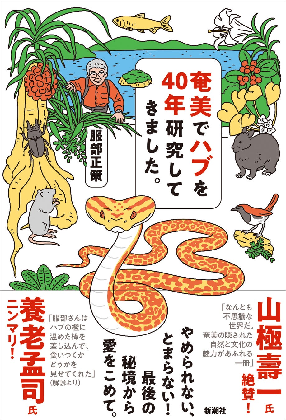 奄美の自然の守護神、とも呼ばれるハブを研究して40年。奄美の酒を飲み、人々と暮らし、山の隅々までずんずん歩き回った著者、服部正策さんが、奄美の面白さを写真とイラスト、地図満載(50点以上!)で伝える一冊『奄美でハブを40年研究してきました。』を3月15日、新潮社より刊行いたします。長年奄美の自然に楽しんできた養老孟司さんが解説を、何度も遊びに行ったという山極壽一さんが推薦をくださっています。