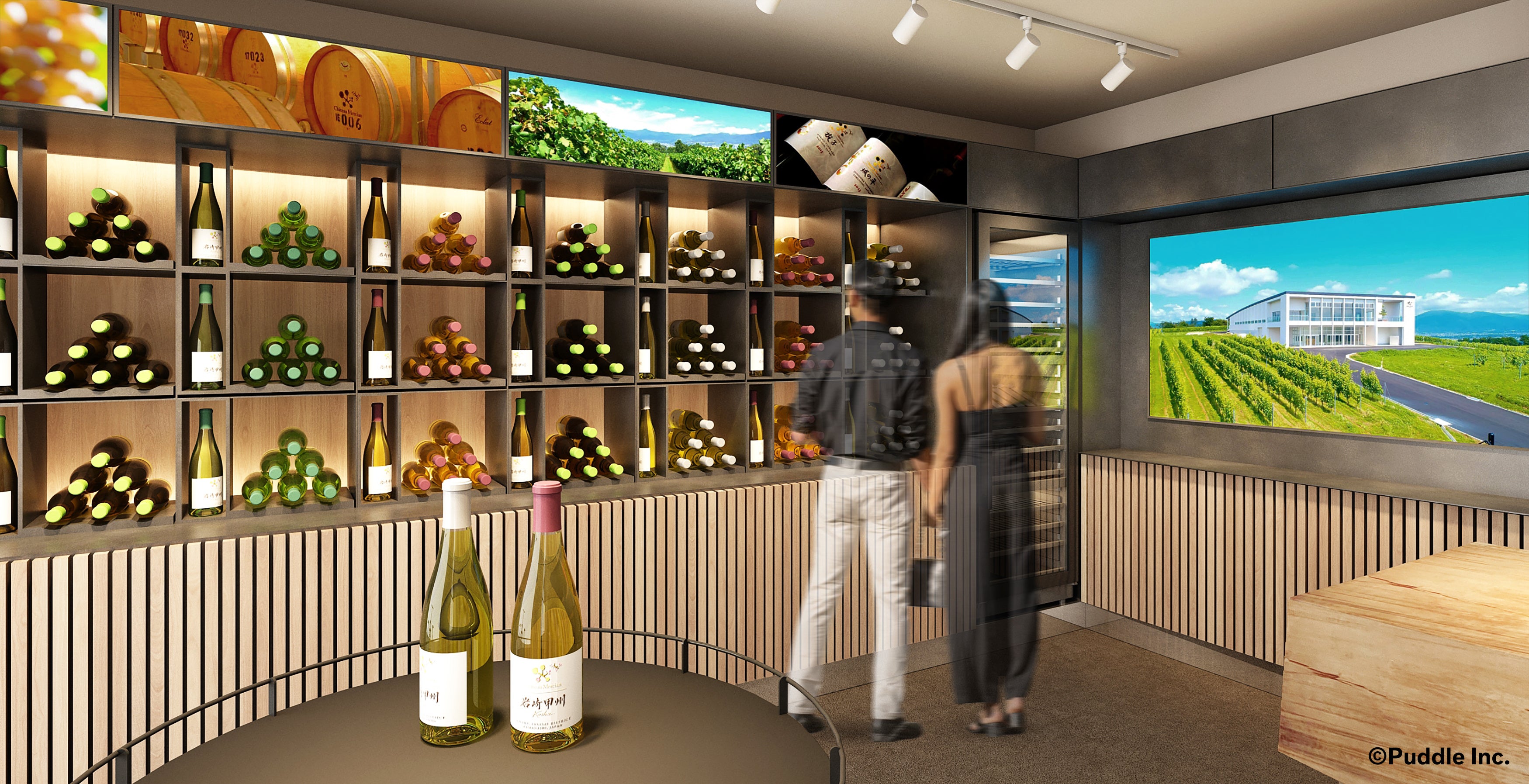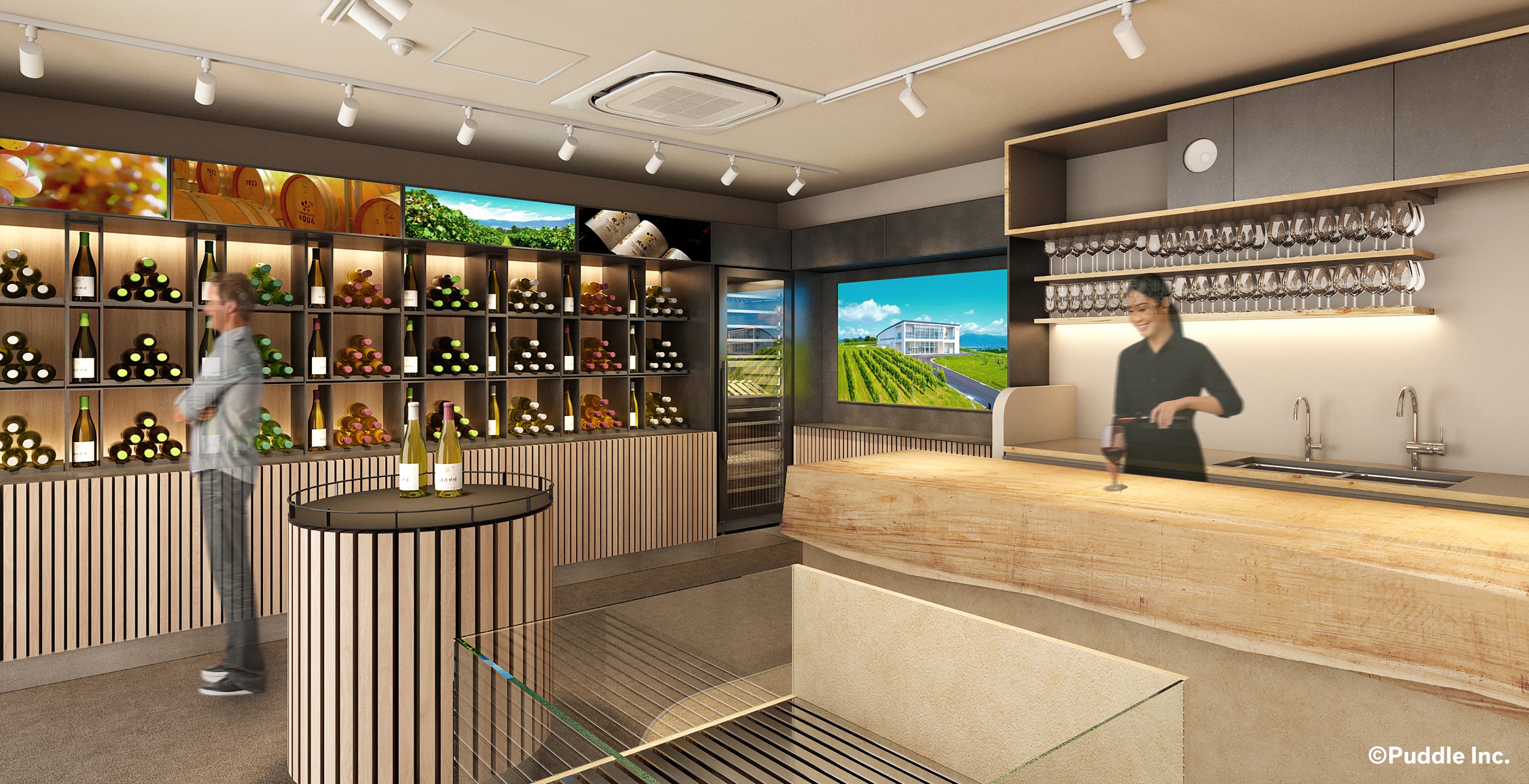 店内にはテイスティングカウンターおよび大型ビジョンを設置し、ワイナリーにおける季節の移ろいやブドウの生育過程、ワインの仕込みの様子をご覧いただきながら試飲をお楽しみいただけます。