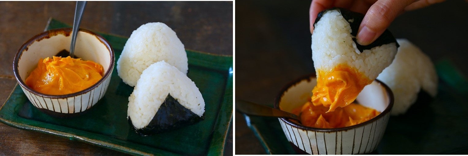 通常、具材が1種類のおにぎりもディップにすることで何度でも美味しい!瓶詰めの粒ウニを使ったバターディップを。背徳感のある味わいです。