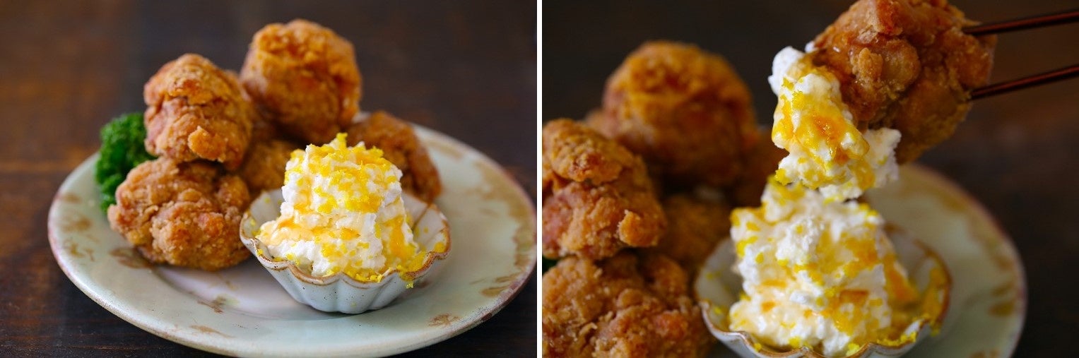 唐揚げにフワッフワのホイップディップの組み合わせ。レモンの皮を削ることで彩りの美しさ、爽やかな味わいを楽しめます。甘じょっぱさにハマる新感覚なディップです。