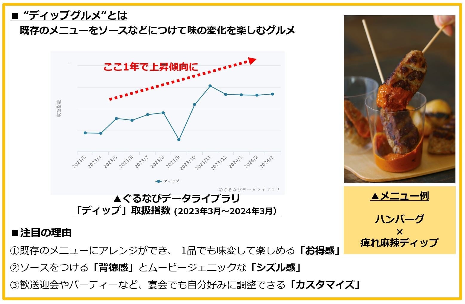 昨年よりチョコレートにディップする「チュロス」やソースにディップする「ピザ」などの人気が高まっていますが、飲食店情報サイト「楽天ぐるなび」掲載飲食店が取り扱うメニューの割合を示す「取扱指数」でも「ディップ」をメニューに取り入れる店舗の割合はここ1年で上昇傾向にあります。