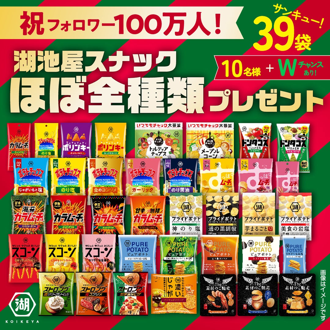 祝フォロワー100万人!湖池屋スナックほぼ全種類プレゼントキャンペーン