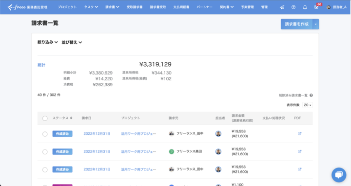 請求金額が一覧で確認できます。freee業務委託管理で上長や経理担当者の承認作業も可能です。