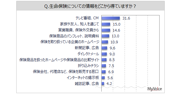 生命保険に関する情報源は(複数回答)、「テレビ番組、CM」が31.6%、「家族や友人、知人を通じて」「営業職員、保険外交員から」「保険商品のパンフレット、説明資料」「保険を取り扱っている企業のホームページ」が各10%台です。