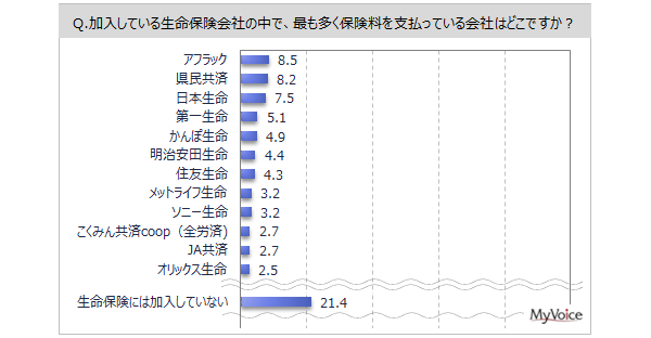 加入している生命保険会社の中で、最も多く保険料を支払っている会社は、「アフラック」「県民共済」「日本生命」が8~9%となっています。