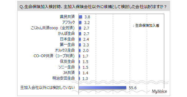 生保加入者のうち、主加入保険会社以外に候補として検討した会社がある人は4割弱です。『アクサダイレクト生命』『チューリッヒ生命』主加入者で比率が高くなっています。