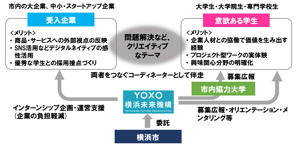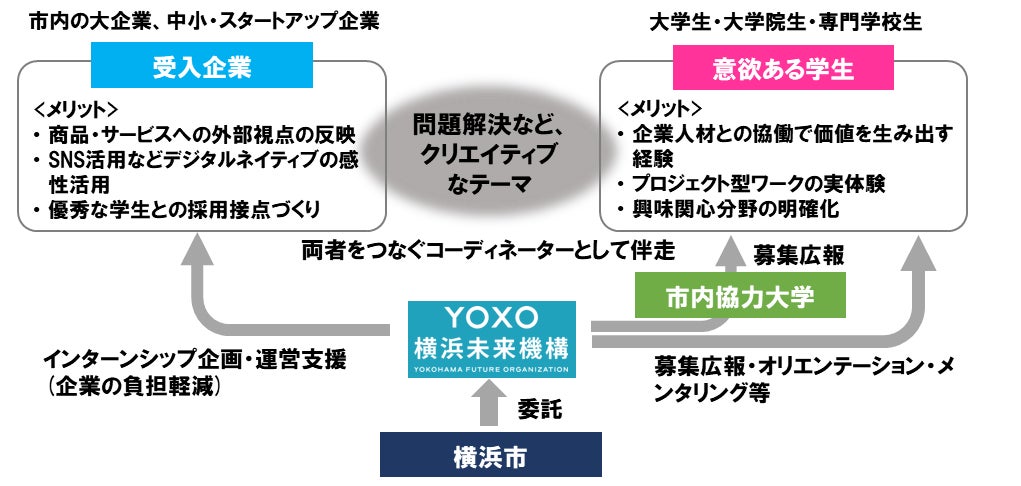 横浜市と横浜未来機構は、「YOXO起業家マインド修得インターンシップ&仕事研究」の取組として、8月開催予定の夏期プログラムに向け、インターンシップ(学生)の受入企業を募集します。今年度は、実習期間を数日間の短期コースを新たに設けるとともに、市外在住・通学の学生でも参加できるよう対象を拡大しました。