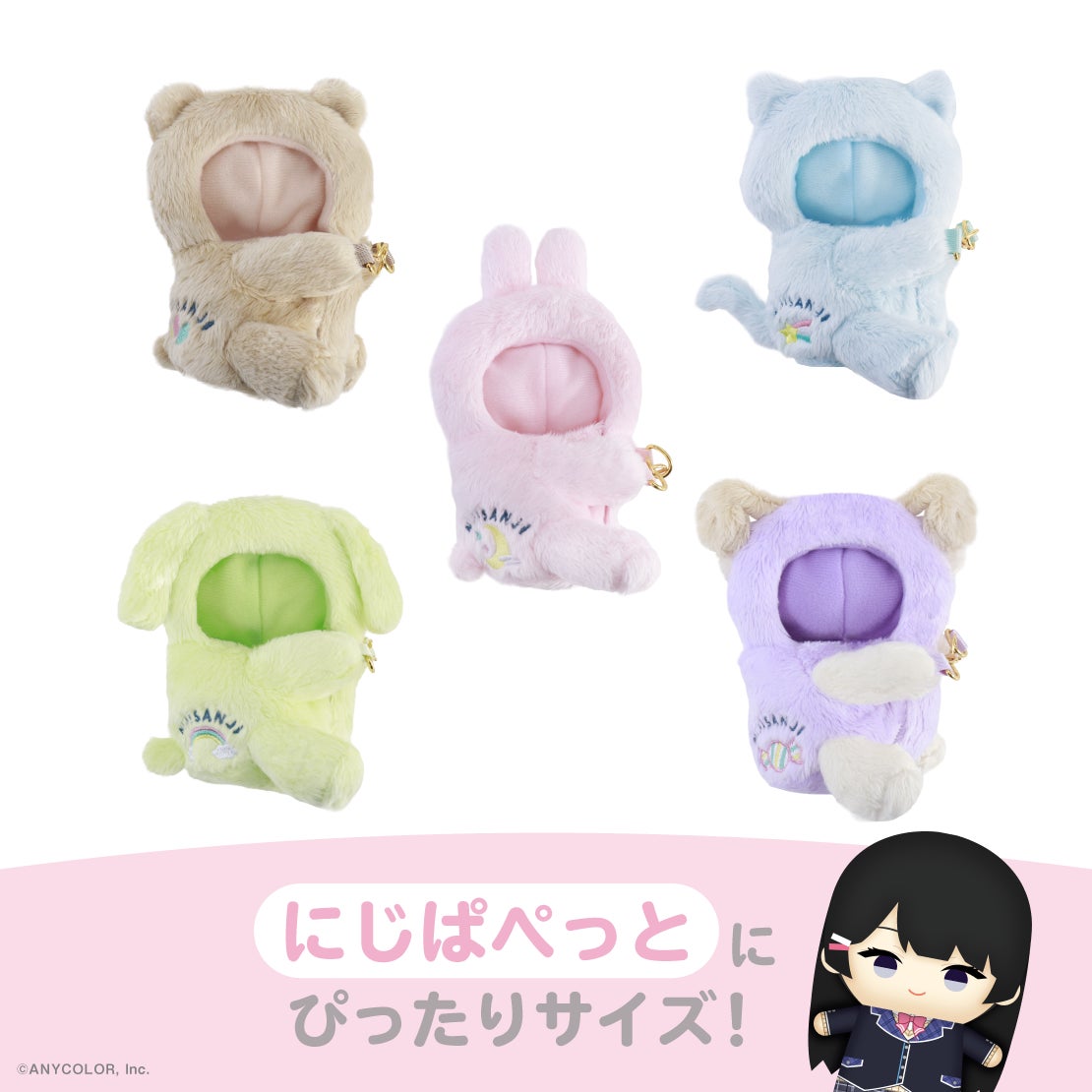 グッズラインナップは、にじぱぺ抱きつききぐるみ、にじぬい抱きつききぐるみ、ポンチョ、パジャマ、あにまるアイマスク、おふとんポーチの6種類。