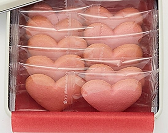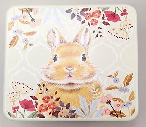 思わず目が合う、かわいいうさぎのクリーム色の缶に、ハート型のイチゴクッキーが並んでいます。