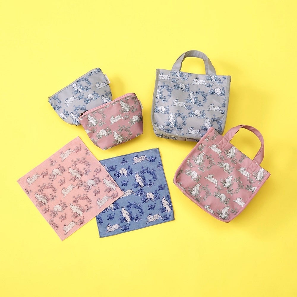 イラストレーターのしらとあきこさんが描くうさぎ柄を総柄でプリントした、タオルハンカチ、ランチトート、ポーチ。新春のギフトにも最適。