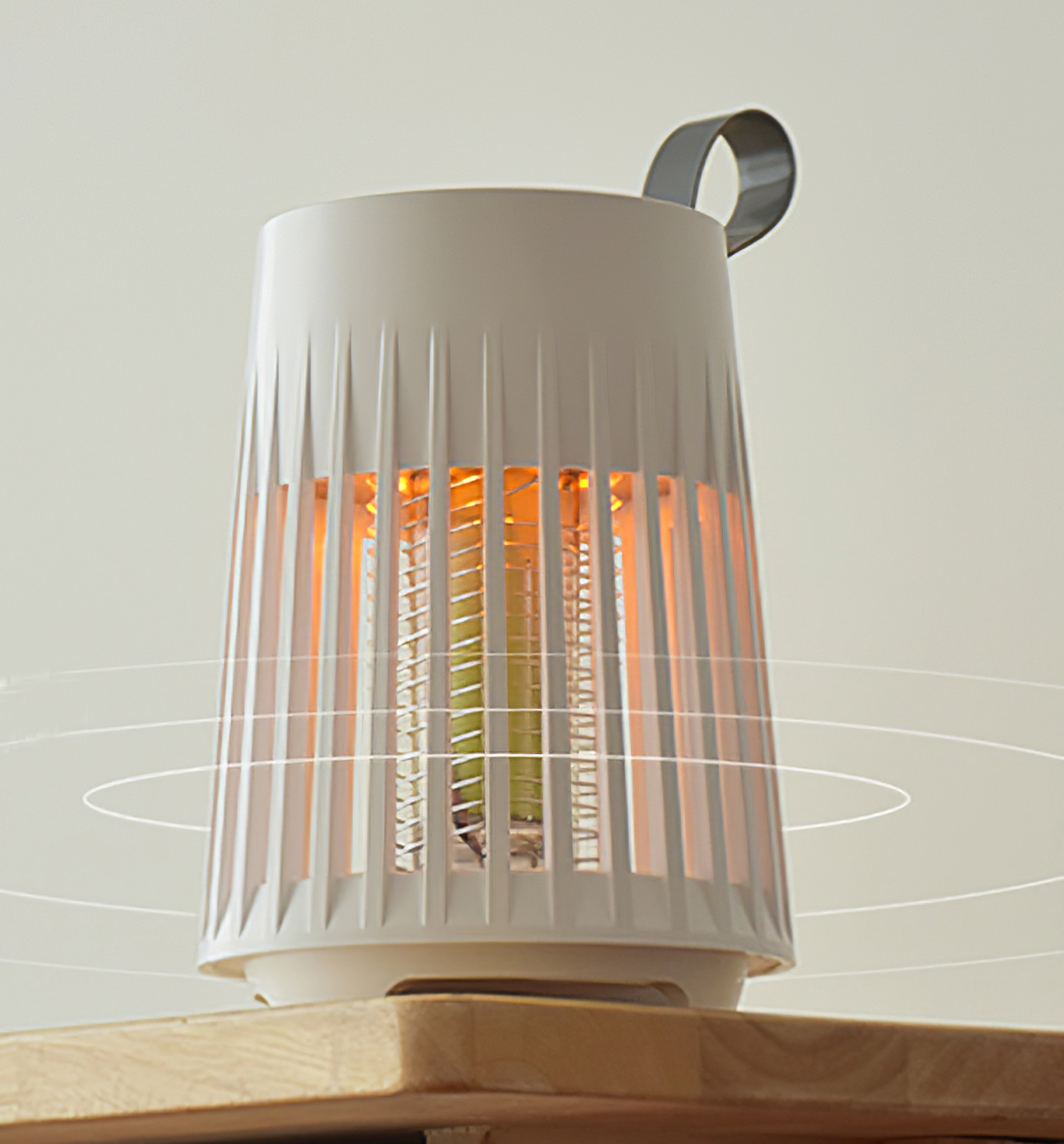 UV光源+人体体温模倣+二酸化炭素で360°から虫をおびきよせ、内側の電撃格子で殺虫します。殺虫時には、電撃によるパチッという音がします。