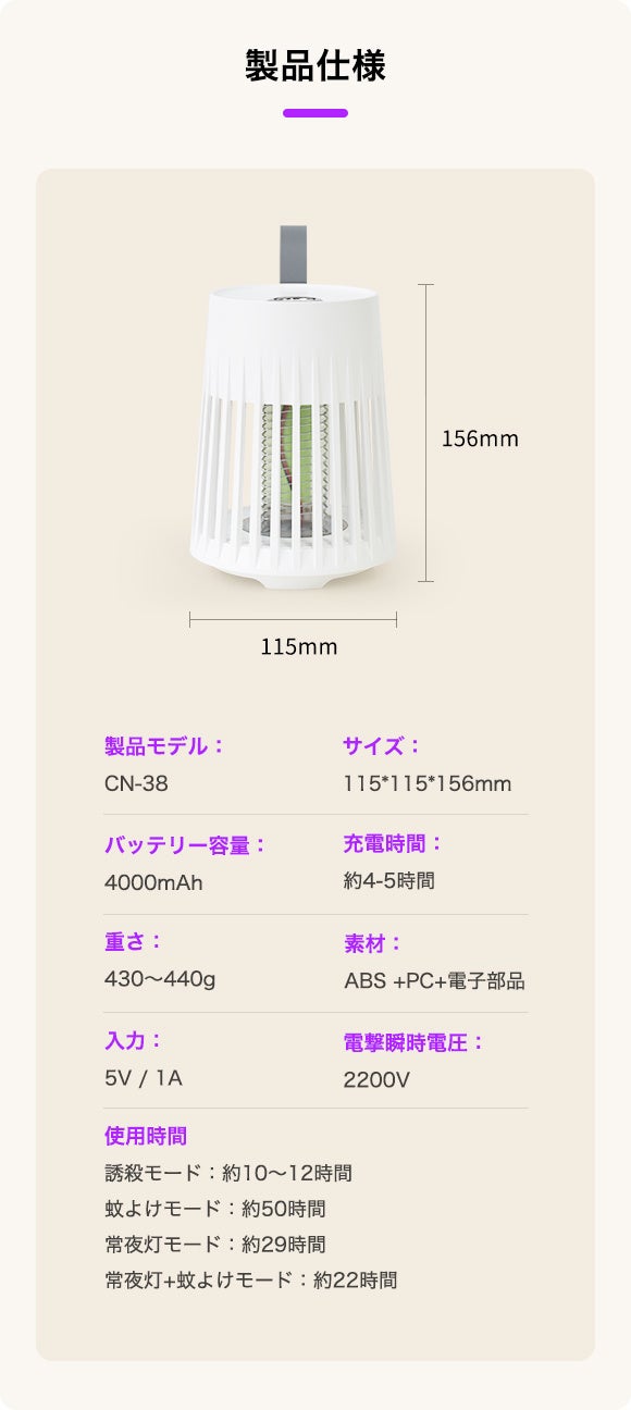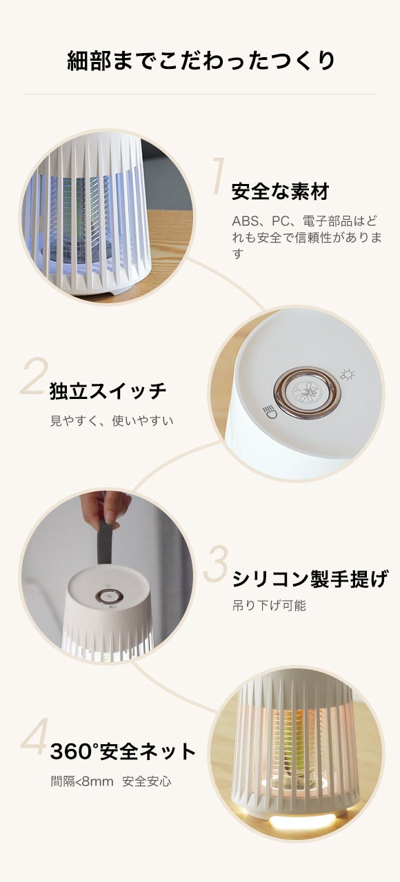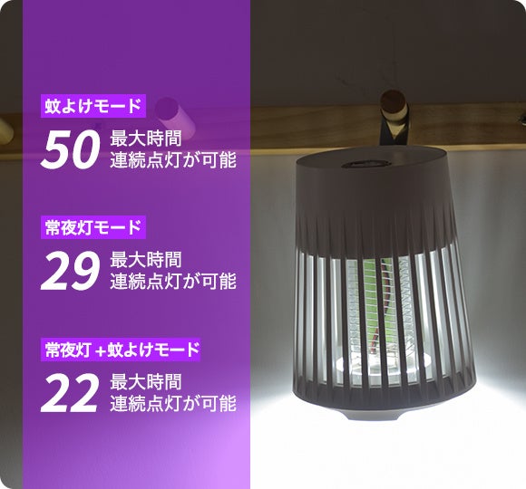 長時間稼働することができ、子供からお年寄りまで蚊から守るため、穏やかな夜を過ごせます。また、コンパクトかつ軽量で持ち運びにも便利です。