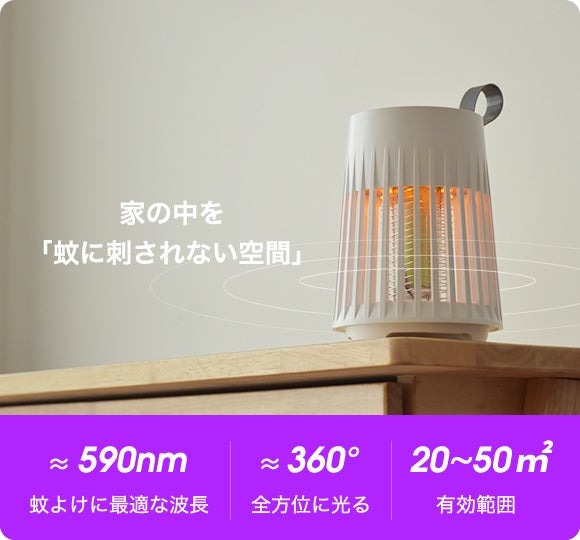 【Mosoco 電撃殺虫器】は蚊が嫌う波長(590nm)の黄色光を利用することで蚊を有効に遠ざけることができます。無音で光が眩しすぎることもないため、寝ているときでも快適に使っていただけます!