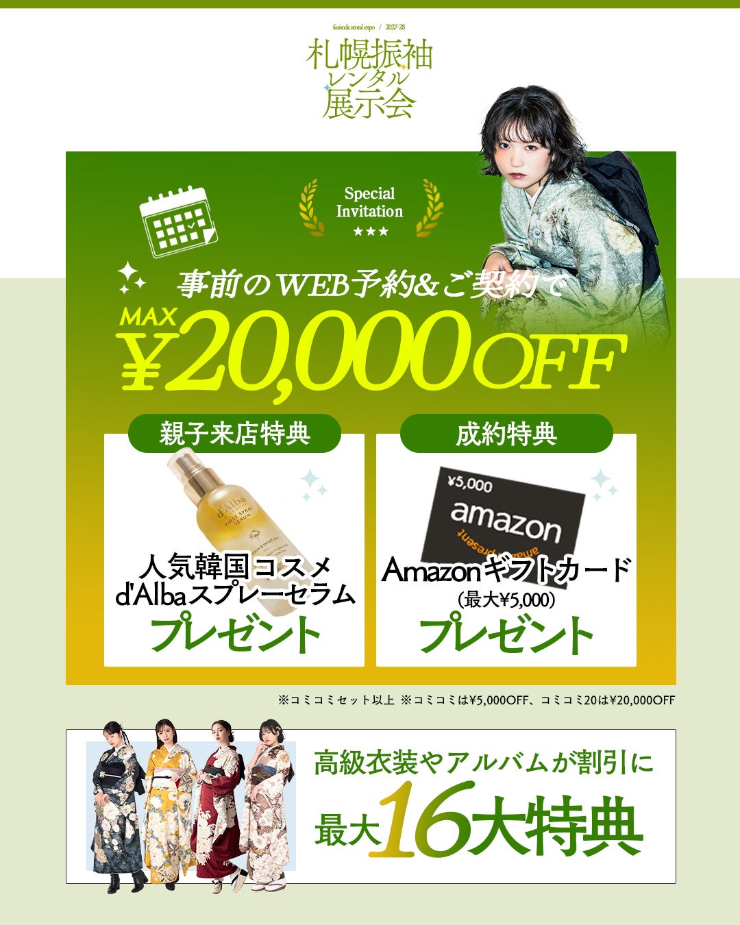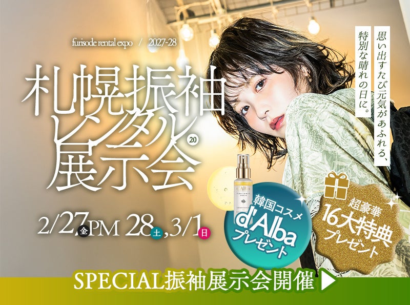 札幌エリア2店舗合同!2/27PM〜3/1開催の振袖展示会。憧れの新作振袖半額や総額数万円相当の無料特典など、新成人の「なりたい」を叶える16大特典が登場。