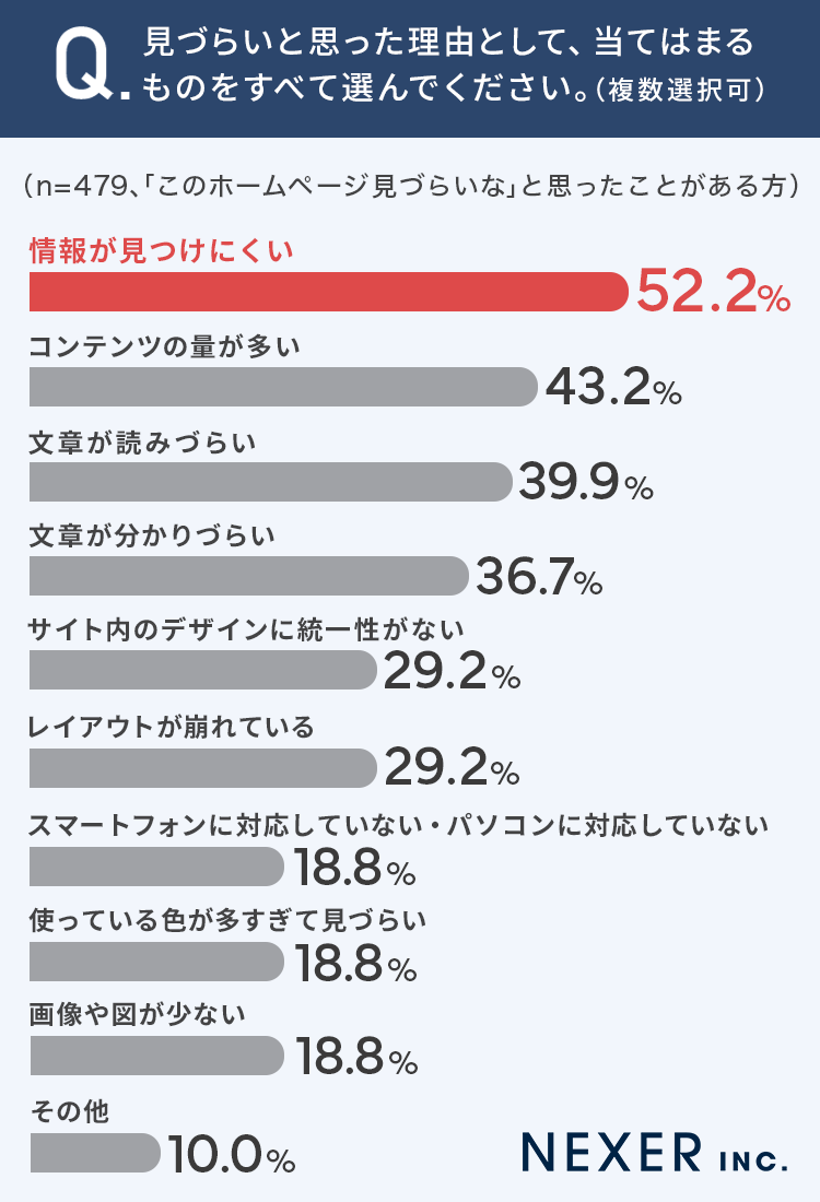 52.2%の方が「情報が見つけにくいホームページは見づらい」と回答しています。