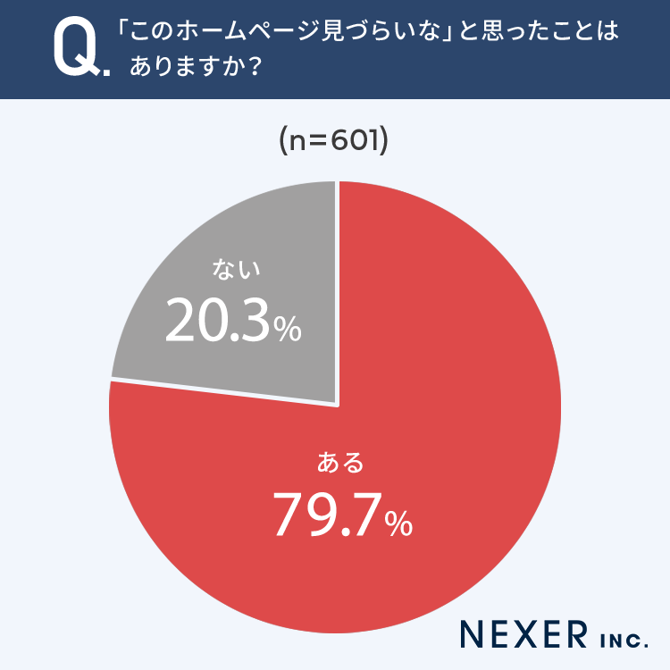 79.7%とほぼ8割の方が「このホームページ見づらいな」と思ったことが「ある」と回答しています。