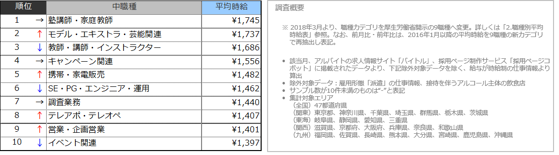 関東エリアの平均時給は1,267円(前年38円増、前月比5円増)、東海エリアの平均時給は1,207円(前年比53円増、前月比5円増)、関西エリアの平均時給は1,215円(前年比21円減、前月比6円増)、九州エリアの平均時給は1,161円(前年比5円減、前月比15円増)となりました。