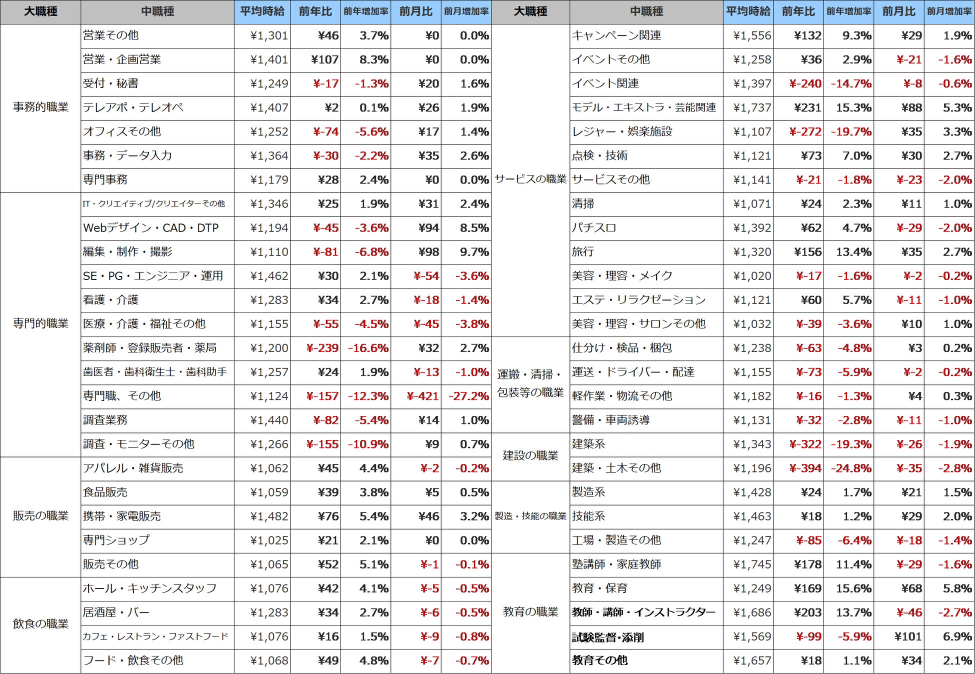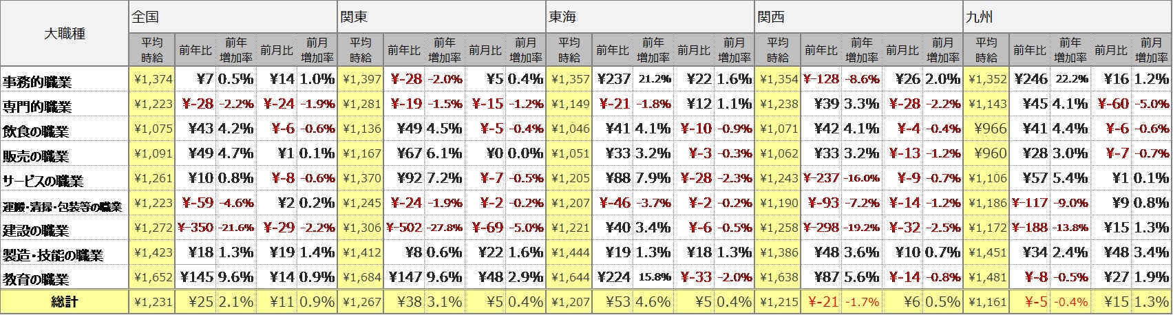 職種別の平均時給は、9職種中6職種の大カテゴリが前年を上回りました。事務的職業は1,374円(前年比7円増、前月比14円増)、専門的職業は1,223円(前年比28円減、前月比24円減)、飲食の職業は1,075円(前年比43円増、前月比6円減)、販売の職業は1,091円(前年比49円増、前月比1円増)、サービスの職業は1,261円(前年比10円増、前月比8円減)、運搬・清掃・包装等の職業は1,223円(前年比59円減、前月比2円増)、建設の職業は1,272円(前年比350円減、前月比29円減)、製造・技能の職業は1,423円(前年比18円増、前月比19円増)、教育の職業は1,652円(前年比145円増、前月比14円増)となりました。