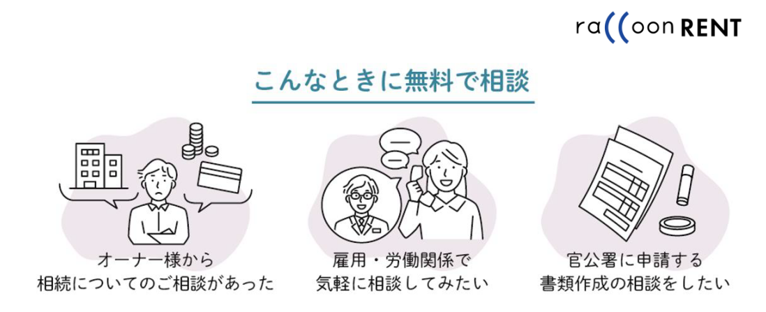 株式会社ラクーンレント(本社:東京都中央区、代表取締役社長:高山 茂満、以下 ラクーンレント)は、取次店登録をしている不動産会社や物件の個人オーナーに向けて、税理士、社会保険労務士、公認会計士、中小企業診断士、行政書士に無料で相談できる付帯サービスの提供を開始しました。