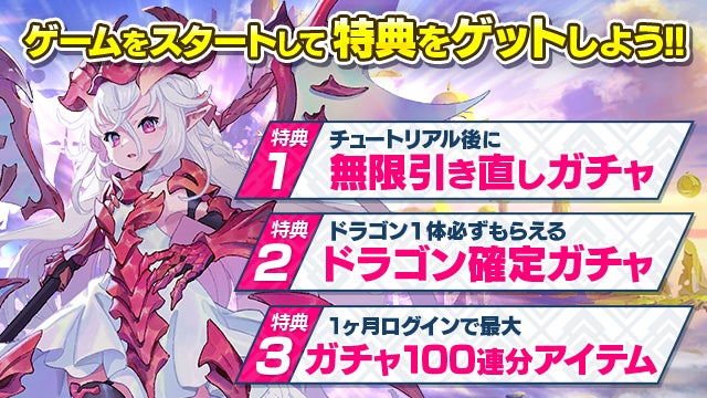 毎日のログインを重ねることで、バトルの切り札であるレアキャラの「ドラゴン」を確定で入手できるガチャアイテムがもらえるほか、ゲームを続けて遊ぶことで最大100連分のガチャが可能となります。詳しくは、特典ページをご覧ください。